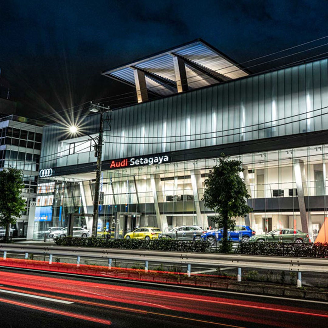 Audi 世田谷ショールームは、日本を代表する建築家、安藤忠雄氏が設計したアウディビルに構えております。大きなガラス張りの建物が特徴で、夜間照明に輝く展示車両がまるで「ショーケースの中の宝石」に見えるようデザインされております。地下1階に最新鋭の機器を完備したサービス工場、1~2階がショールームとキッズスペースとなっております。